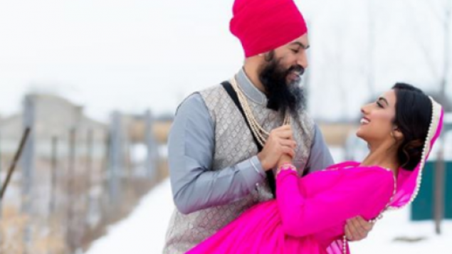 今年秋季刚刚当选为加拿大联邦新民主党领袖的辛格Jagmeet Singh素有穿着打扮新潮、特别喜欢颜色鲜艳的锡克族包头巾的名声。 最新一张辛格与准新娘的照片再次显示了这位新民主党领袖对鲜艳颜色的喜爱。 据加拿大广播公司记者John Paul Tasker报道,出现在社交媒体上的辛格与准新娘古尔吉兰Gurkiran Kaur Sidhu身穿旁遮普服装的照片和视频显示,辛格与古尔吉兰的好事将近。 古尔吉兰是多伦多专门经营新潮旁遮普服装的Jangiiro公司的创办者之一。 在此之前 HuffPost Canada 已经报道了辛格与古尔吉兰订婚的消息。JANGIIRO/INSTAGRAM