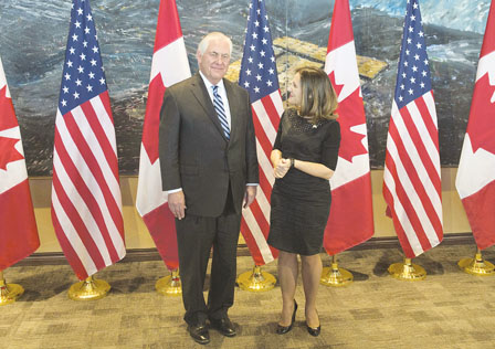 加拿大外交部长方慧兰周二在渥太华与美国国务卿蒂勒森合照。(加新社)