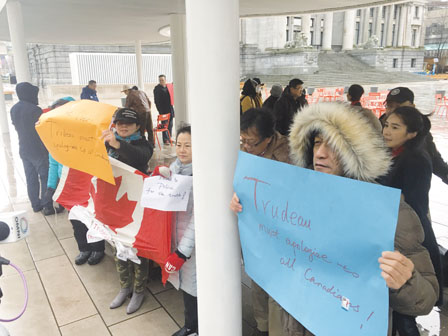 数十名华裔昨日冒雨在温哥华市中心集会,就穆斯林女孩被指虚报头巾被剪一事,抗议媒体与总理处事不公。
