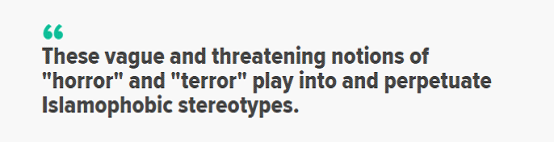这些标语牌包括:“Hoax Today, Horror Tomorrow”“Against Political Terror Attack”……他表示:“这样的字眼语义模糊,而且带有威胁意味,是‘伊斯兰恐惧症’的典型症状,甚至是对穆斯林群体的歧视和污蔑。”