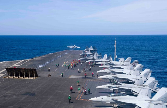 卡尔文森号航母打击群于1月5日离开美国西海岸圣迭戈,启程前往西太平洋地区执行部署。当时媒体推测,该舰预计在中国春节前抵达南海。1月31日编队抵达美国关岛。这也是她本次西太平洋部署的首站。与该舰随行的还有伯克级导弹驱逐舰韦恩W梅耶号(DDG-108)和米歇尔墨菲号(DDG-112)。