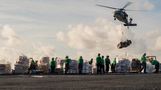 2月10日南海,一架隶属于HSC-4中队的MH-60S直升机正在为卡尔文森号航母(CVN-70)吊运补给(下同)