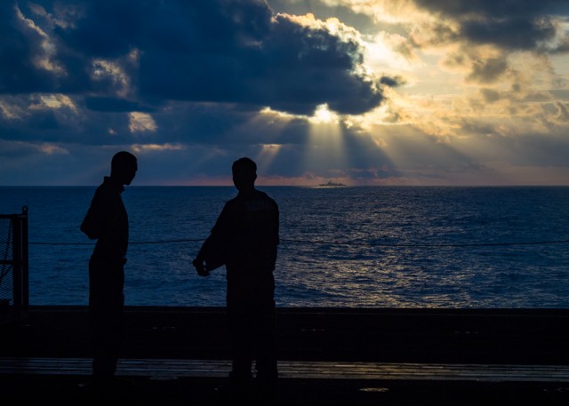 2月10日南海,几个水兵站在卡尔文森号航母升降机上眺望远处的韦恩W梅耶号驱逐舰(DDG-108)