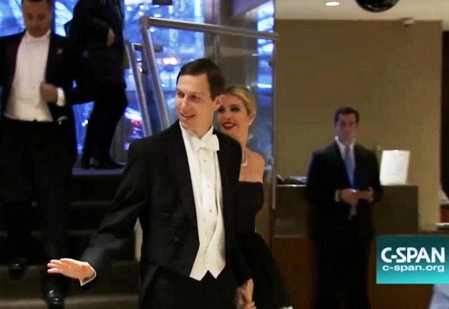川普总统在餐会上开玩笑说,他们今天有点迟到,主要是因为女婿在进口时安检出问题遭到拦检。图为库许纳伊凡卡夫妇进入会场。(取自截频)