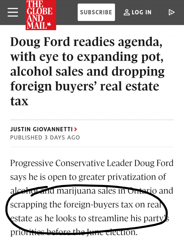 近日,安省进步保守党新任党魁道格·福特(Doug Ford)在接受环球邮报(The Global and Mail)的采访时,表示正在考虑一项取消安省房地产市场的海外买家税,并批评自由党政府推出的15%海外买家税的政策治标不治本,解决房市过火问题应当集中精力与土地开发,兴建可负担房屋入手。