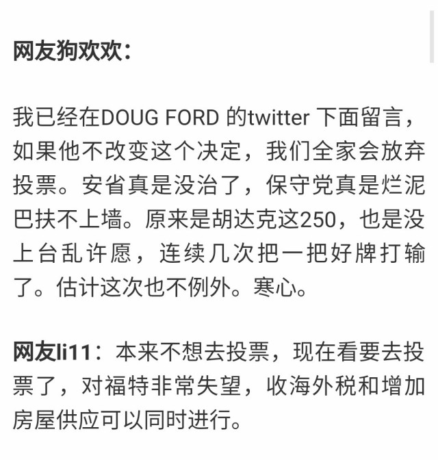 福特此番言论一出,立刻引发社会哗然,此前曾表示支持福特的华人网友直接跳反,怒斥福特比胡达克都不如,保守党就是烂泥扶不上墙!有些网友更是表示对福特简直寒了心,彻底失望,省选全家一票都不会投了。