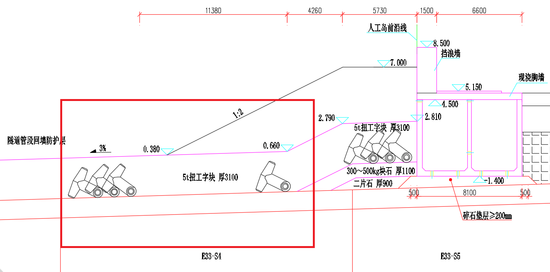 香港网民所说扭工块被冲散位置见如下设计图的红圈区域。该区域为岛隧结合部E33管节位置,该位置在基础设计时,为了保证基础承载力的均匀过渡,进行了沉管隧道顶部回填防护荷载的减载设计,该部位隧道顶部采取安装减载沉箱+回填轻质材料(陶粒)+水下安装扭工字块潜堤的结构形式,扭工字块的设计标高即在水面以下并按规范要求采取随机摆放。