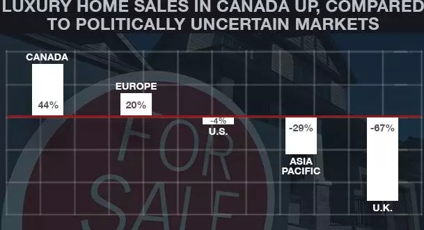 加拿大头条(canadanews)了解到,该份报告是佳士得基于对全球101个市场,价值100万美元以上的房屋的销售数据和其他因素进行分析。其中英国的奢侈住宅销售额较去年同期下降了67%,而美国的销售额则下滑了4%,亚太地区市场下滑了29%。相比之下,欧洲的销售额增长了20%,加拿大的销售额增长了44%。