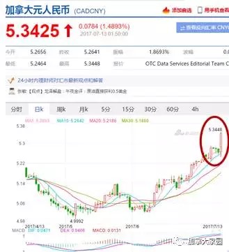 今天凌晨,加币兑人民币暴涨!一根大阳线,直接突破5.34一线。原因很简单:加拿大7年来,第一次加息了!!!