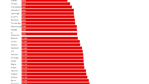 最后来看看CBC的统计,你所在的城市平均租金是多少呢?