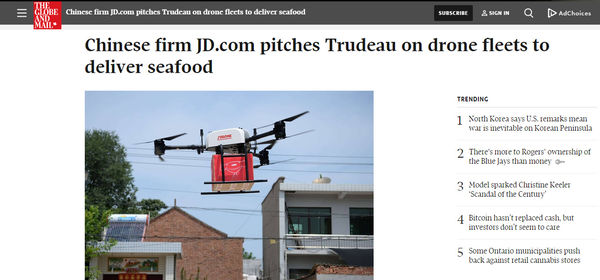 除了无人机之外,刘强东还承诺,未来3年加拿大商品在京东平台的销售增速将不低于200%,并希望明年在京东平台上销售大约5亿加元的商品,其中一半为鱼类和贝壳类产品。