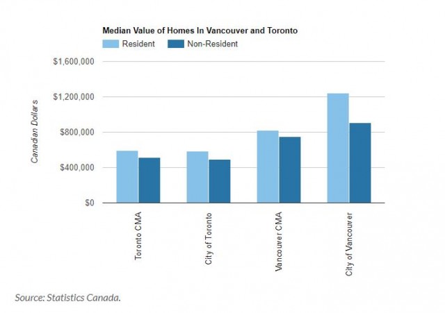 温哥华本地居民长期以来对外国人买公寓的问题抱怨颇多,而加拿大统计局的数字证实了这种情绪不是无源之水。温哥华人口普查都会区的居民房屋价值中位数是$820,000,非居民的房屋价值中位数是$751,000,比前者低8.41%。而且和多伦多一样,这种差异在温哥华市也更加明显。