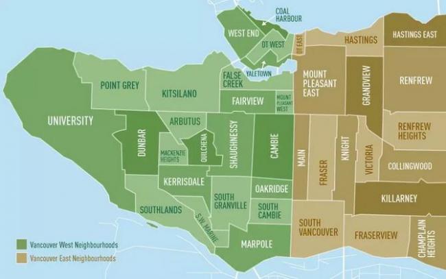 在大温地区,房价最贵的当属温哥华市,但温哥华市的西区和东区在大温房地产市场上属于两个不同的级层。温东和温西理论上以Main街为分界线,大家一般认为温西是高档区域,豪宅较多,温东则是温西的对立面。