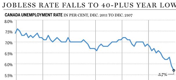 统计局称,去年12月加国失业率降至5.7%,是42年有纪录以来的最低水平。79,000个工作的增加量,远超彭博社调查的经济师们所预测的增加约2,000个工作。