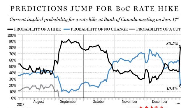 加元币值因此攀升,1加元一度可兑换80.74美分。投资者们判断加拿大央行本月加息的可能性,从之前的40%攀升至约80%。加拿大6大银行中有5大银行都认为本月将再次加息。
