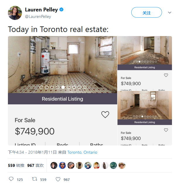 多伦多女记者Lauren Pelley通过推特发了一个帖子,还写道,这就是多伦多眼下的房市:“Today in Toronto real estate”,结果引来大量围观,转推的有近600人,称喜欢的更有上千人,评论者也是相当踊跃: