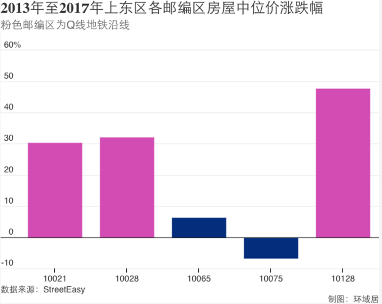 整个上东区由五个邮编区组成,分别为10021、10028、10065、10075和10128。就房屋售价中位数而言,新地铁站所在的三个邮编区的涨幅要明显高于其他两个邮编区。具体的数据如下: