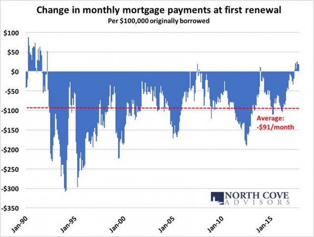 North Cove Advisors的Ben Rabidoux说,从1990年代开始,每10万元按揭贷款,按五年期固定利率计算,到第一个还款期(first term)结束时,月还款额平均减少$91元。而随着利率上升,现在房主在首次renewal时,就会看到平均月还款额是增加了。