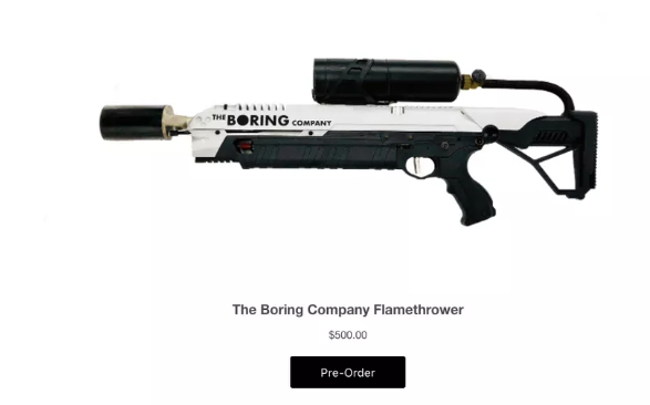 埃隆·马斯克(Elon Musk)已经售出价值超过400万美元的火焰喷射器。马斯克所有的The Boring公司正在销售一个500美元(含税)的火焰喷射器。
