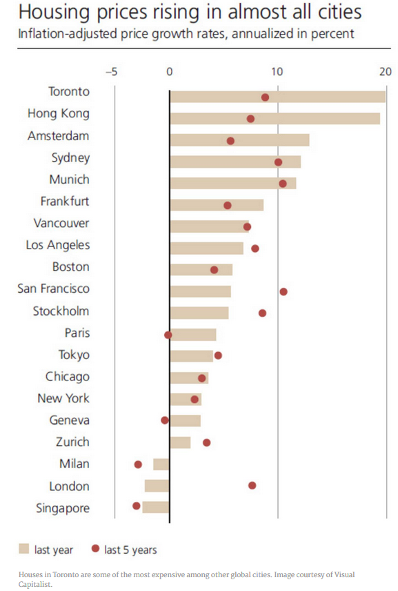 根据总部设在温哥华的商业与投资公司VC(Visual Captialist)刚刚发布的一份报告,全球有8大城市名列房地产泡沫风险最大的城市,其中加拿大的多伦多位居第一!