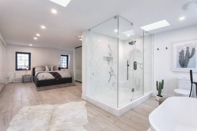 上到二楼,也可以看到变窄为宽理念的继续延伸:主卧与洗手间竟然合为一体,更妙的是,为了给“观众”宽敞明亮的效果,除了卧式浴缸是纯白色的,立式淋浴间竟然是透明的! 也许讲究隐私的买家对这个有点忌讳,但淋浴间是玻璃一面朝浴室,墙壁一面朝卧室,实际上不伤大雅。
