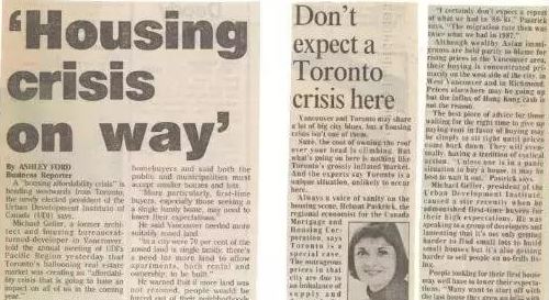 1989年3月22日Financial Post 的一篇文章中,资深记者Frank O'Brien 强调了海外买家抢购大温房屋的问题,以及开发商对如果海外买家停止购买对本地市场的担忧。而现在海外买家同样被谴责是推高房价的原因,省府出台多项措施限制海外买家。