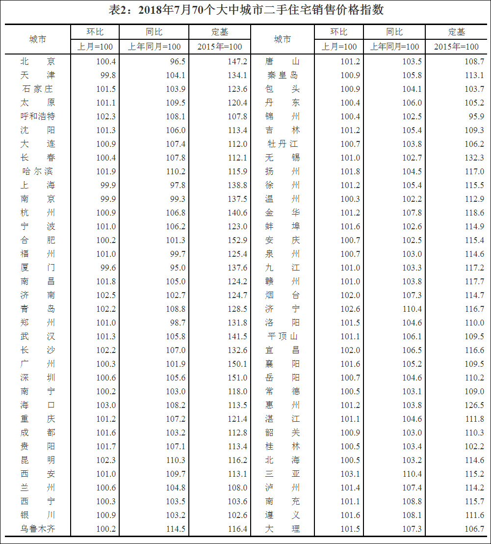 国家统计局城市司高级统计师刘建伟解读称,7月份,一二线城市新建商品住宅销售价格环比涨幅回落,三线城市略有扩大。 据初步测算,从环比看,4个一线城市新建商品住宅销售价格上涨0.2%,涨幅比上月回落0.4个百分点:其中上海价格下降,北京、广州和深圳价格分别上涨0.2%、0.6%和0.5%。 31个二线城市新建商品住宅销售价格上涨1.1%,涨幅比上月回落0.1个百分点;35个三线城市新建商品住宅销售价格上涨1.5%,涨幅比上月扩大0.8个百分点。 一线、二线、三线城市二手住宅销售价格分别上涨0.2%、1.0%和1.1% 另外,从同比看,70个大中城市中,一线城市新建商品住宅销售价格上涨0.2%,上月为持平;二手住宅销售价格上涨0.5%,涨幅比上月扩大0.4个百分点。 二线城市新建商品住宅和二手住宅销售价格分别上涨7.3%和5.5%,涨幅比上月分别扩大1.0和0.9个百分点;三线城市新建商品住宅和二手住宅销售价格分别上涨6.7%和5.1%,涨幅比上月分别扩大0.7和0.8个百分点。