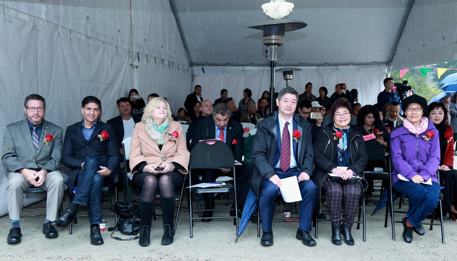 中国侨联副主席、中国侨商联合会代表团团长朱奕龙,中国驻温哥华总领事佟晓玲,加拿大国会议员黄陈小萍,中国侨商联合会秘书长安晨,BC省议员Stephanie Cadieux,中国侨商联合会常务副会长、香港胜记仓集团董事局主席郭泰诚,素里市代市长Vera leFranc,中国驻温哥华商务参赞俞善君,素里市议员、市长候选人Tom Gill,素里市市议员Mike Starchuk、Bruce Hayne,加拿大中国工商联合会主席滕达,天达康基因工程有限公司董事长余俊作,保利高投资集团董事长周紫云,保利高投资集团总经理Hugh Carter,北美商谷发展有限公司董事长王化,加中贸易理事会BC分会代主任Jane Wang,北美商谷全球购有限公司总经理吴成海,胜记仓(加拿大)控股有限公司董事长吴虹仪,保利高投资集团行政总裁曹振良等出席奠基仪式并共同为奠基石培土。