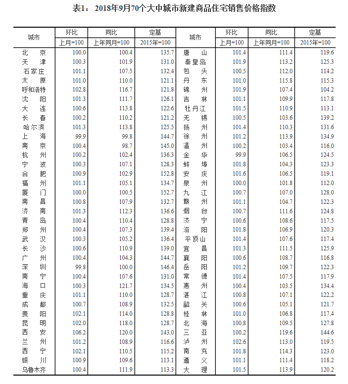 今日(10月20日)上午,国家统计局发布了2018年9月份70个大中城市商品住宅销售价格变动情况统计数据。