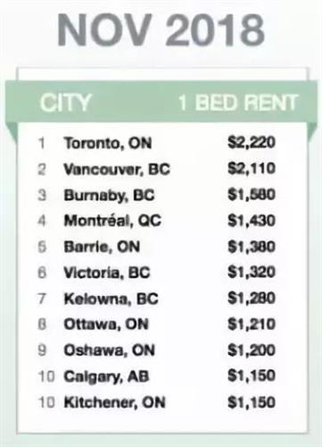 和10月相比,11月加拿大房租最贵的五个城市丝毫没有变动:从高到低分别是多伦多、温哥华、本拿比、蒙特利尔、巴里。