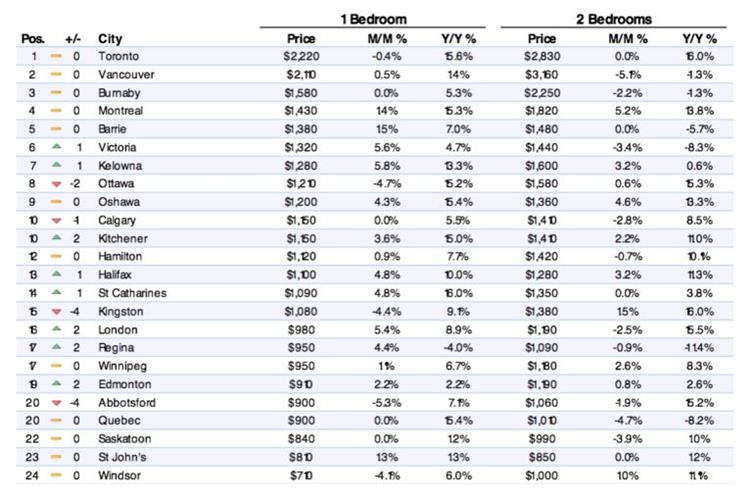 多伦多仍然牢牢位于榜首,单室房租稍降了0.4%到$2,220,双卧室房租保持不变- $2,830。