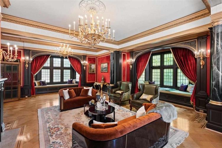 宽大的会客厅也可以做舞厅,华贵大气。过去的主人常在这里开派对。衣香鬓影,贵客盈门。挂着红色幔帐的宽大飘窗,很适合坐下来静静地读书。细铅条做的格子窗,玻璃摸上去有点凹凸不平,这是珍贵的琉璃,100年前手工制作而成。朝着花园的位置是个大阳光房,可以坐在这里,边喝咖啡边欣赏超大花园的非凡景观。