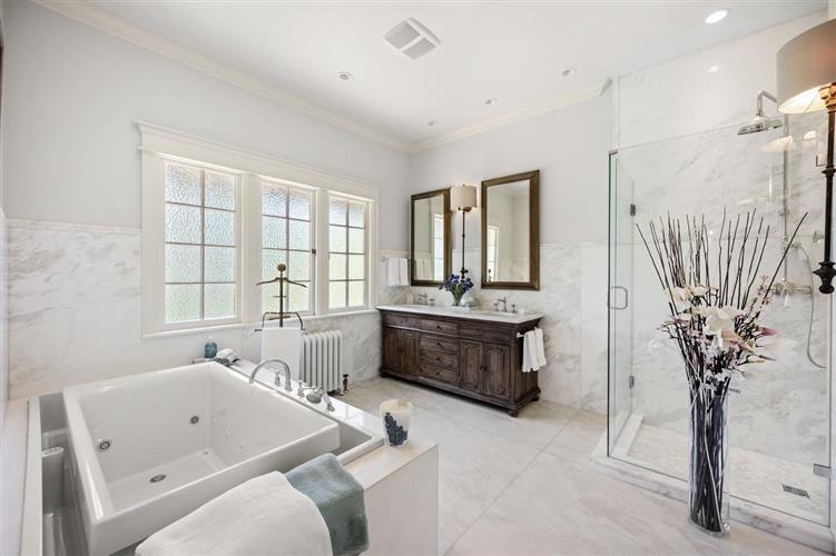 主卧室气派奢华,可俯瞰诗意盎然的后花园。最令人瞩目的是淡蓝色的古老壁炉,还保持着100年前的模样。房间的色彩与之和谐呼应。次卧也别具匠心,墙布是丝质手绘的,并以 Rosemary 庄园作为背景。有意思的是,次卧的立式淋浴室是保留百年前的,浴缸也是原有的古老浴缸翻新的,这些生活设施,件件都是古董,都重现了百年前的繁华盛况。