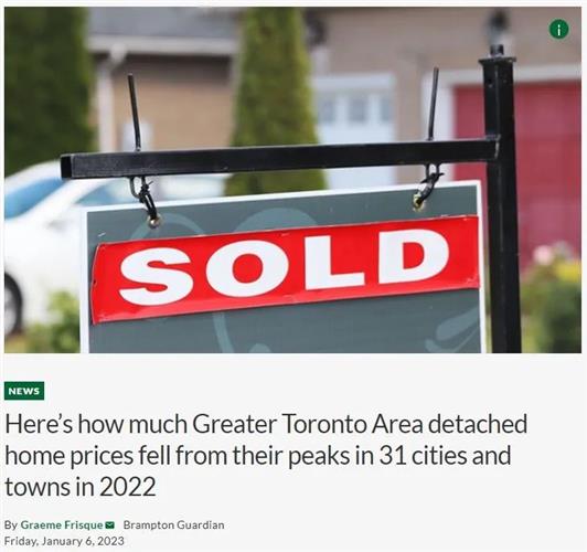 加拿大安省多伦多地产局(TRREB)于1月5日发布了12月大多伦多地区市场销售的统计数据,其中有31个市镇的房价都从去年早些时候创下的历史高位暴跌,其中有12个地区跌幅超过30%。据报道,TRREB监测的31个市镇中,所有都在2022年1月至4月期间达到市场峰值,然后在之后的时间开始下降,其中有12个市镇跌幅超过30%。