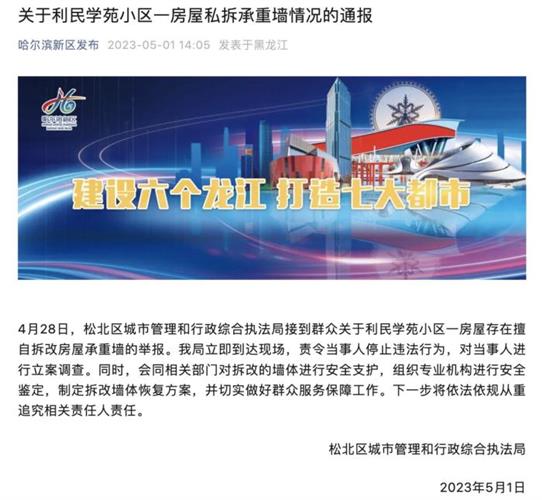 该事件很快引发广泛关注。5月1日,哈尔滨松北区城市管理和行政综合执法局通报:4月28日,该局接到群众后立即到达现场,责令当事人停止违法行为,对当事人进行立案调查。同时,会同相关部门对拆改的墙体进行安全支护,组织专业机构进行安全鉴定,制定拆改墙体恢复方案,并切实做好群众服务保障工作。下一步将依法依规从重追究相关责任人责任。