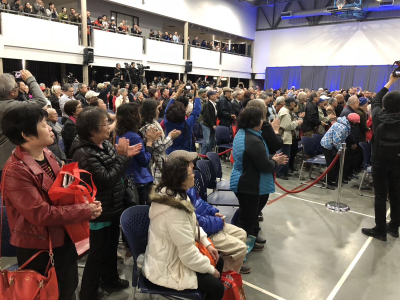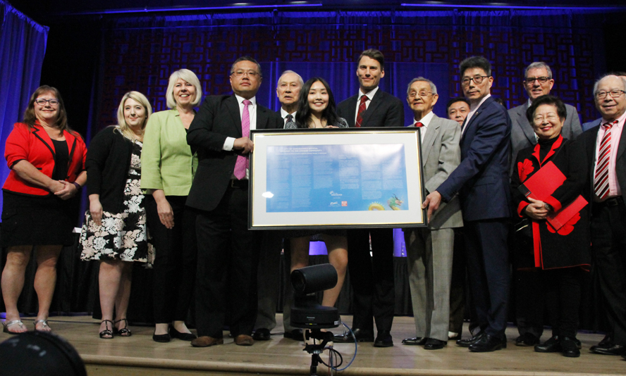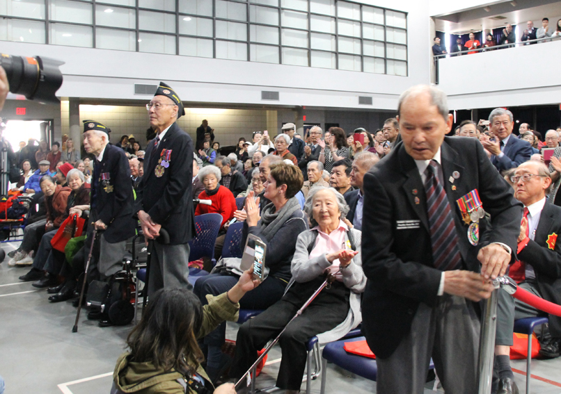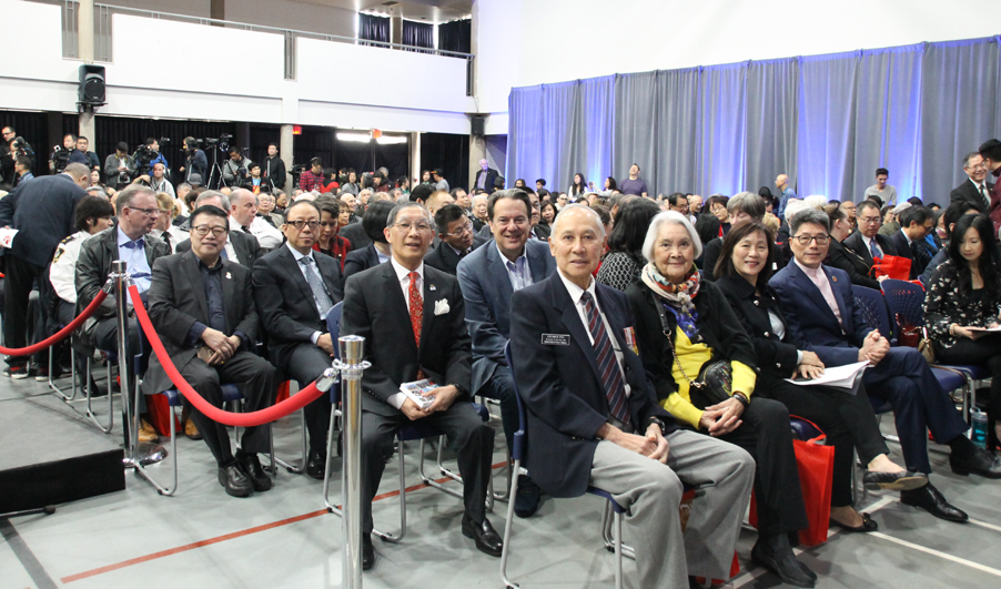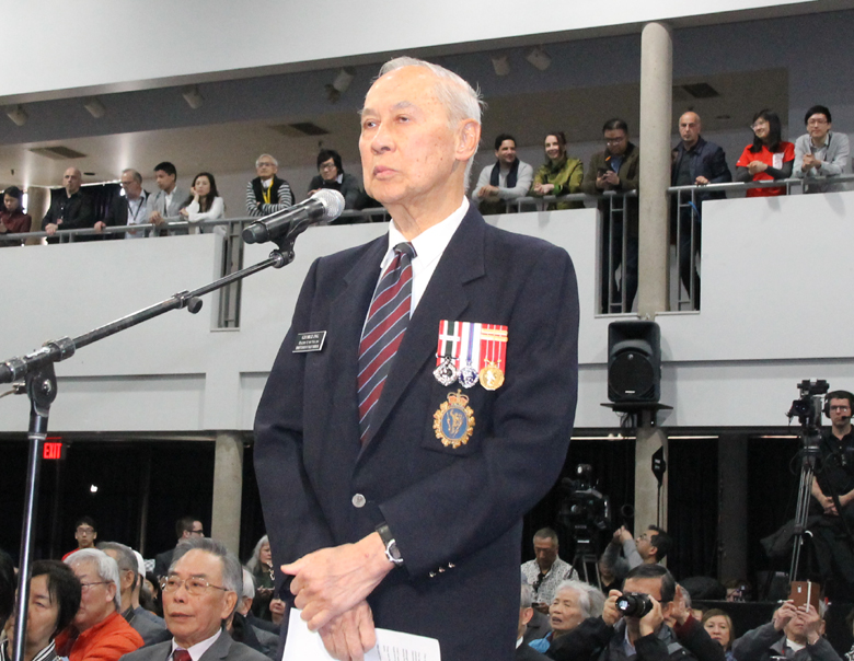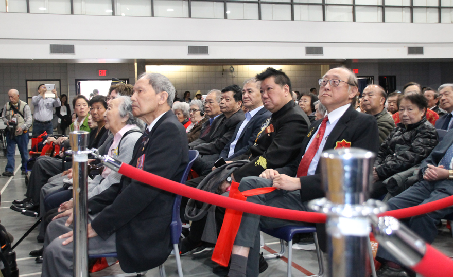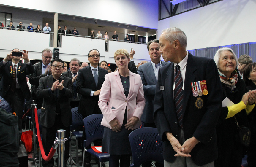 吴英超说,在二战期间共有600名在加华人加入加军参战,你能想象吗——当他们参军准备为这个国家牺牲的时候,这个国家还拒绝他们入籍!二战结束后他们继续抗争,直到1947年,华人才获得入籍的权利。吴英超介绍说,参加过二战的华裔老兵还有14人健在,今天在场有两位,他们是101岁的Thomeas Wang和99岁的Ron Lee!这时,全场掌声雷动,向两位老人表示崇高敬意。