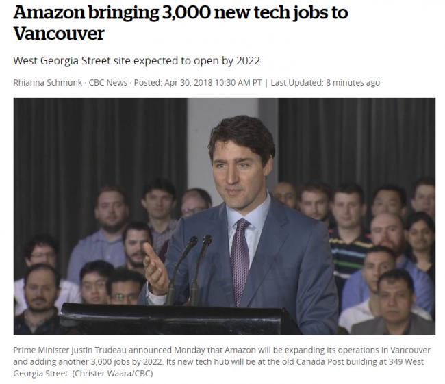 加拿大总理特鲁多今日上午宣布,亚马逊计划扩大其在温哥华的科技中心,并为温哥华带来3,000个就业机会。