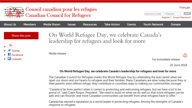 难民理事会的公告题为:在世界难民日, 我们庆祝加拿大的领导作用并期待更好。公告中说,我们要庆祝的是,加拿大敞开大门和心怀拯救了许多生命。许多加拿大人今天仍然活跃在帮助难民的事务上,部分是因为他们或他们的父母就是在加拿大受到了庇护; 他们在用各自的方式为社区做贡献。