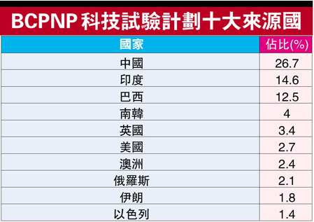 统计显示,科技人才试验计划引进的移民以中国科技人才最多,有246人,占比高达26.7%;第二位印度占14.6%,第三位巴西占12.5%。 省政府指出,科技人才试验计划每年并无设定目标人数,而是配合本省科技需要劳工的情况作出调整,由于该计划确实帮助本省科技业老板快速引进外国人才,使得该计划今年第一季的申请已有323宗,较去年同期增加22%。科技人才试验计划刚在去年推出时,合资格申请的职业项目有32个,而这些合格职业是根据卑诗科技协会(BC Tech Association)以及温哥华经济委员会(Vancouver Economic Commission)对科技业劳工市场进行研究,并选出这32项最缺工的项目。