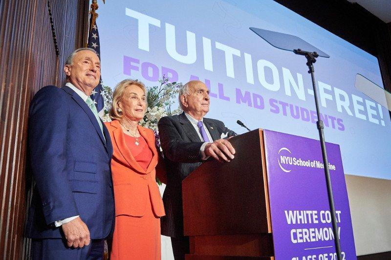 朗格尼(右)和格罗斯曼(右)在当天的活动中宣布“学费全免”计划 图自纽约大学