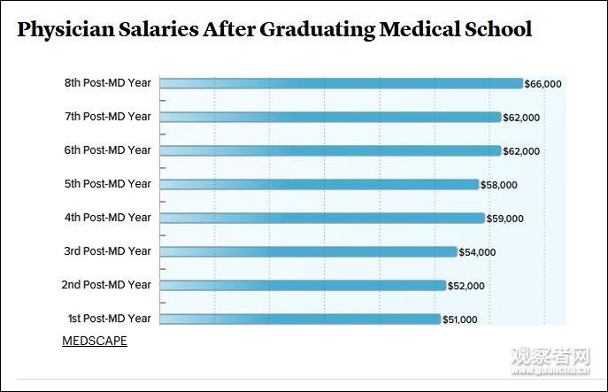 但这并不意味着未来纽大医学院的学生将不用花一分钱:此次免除的仅为学费,学生还将在“伙食”、“住房”、“教参”等项目上自力更生。介于纽大医学院地处纽约繁华地带,学生每10个月还要自己交大约2.7万美元的杂费。 观察者网从纽大医学院网站得知,该院即将在今年秋季迎来102名新学生,目前共有442名学生。此前这里的学费每年约5.5万美元,录取率仅6%。 如果申请学贷,62%的纽大医学院学生无法在读书还清贷款。举个例子,2017届从该院毕业的学生,平均每人身上都背负了18.4万美元的债务。 这个数字看似惊人,但在业内一对比后显得不为过。 美国医学院协会(AAMC)2017年的一份报告显示,像纽大这一类私立学校,医学院学生毕业后平均负债18万美元;公立学校医学生情况稍微好一点,但依然要面对17万美元的学贷压力。而AAMC调查的52所医学院,每年平均学费都在5万美元起跳。 有的读者可能认为:这些个“18万”、“17万”只是暂时,美国医生一年就能赚回来。 实际上高收入只有“转正后”的医生才能享有,对于刚刚毕业的“实习医生”来说,他们必须度过“5万”、“6万”、“7万”的年薪级别,慢慢往上爬。美国内科学会会员崔巍曾介绍,实习期的长短会根据专业不同而定,比如内科是3年,而神经外科要7年,“平均下来也要5年”。![]()