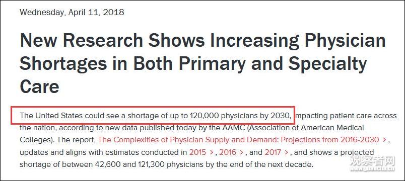 与此同时,美国医界人才正在大量流失。AAMC在2017报告中强调,如今美国的基层医生、农村医生已经出现人手不足的情况。到了2018年,AAMC称在2030年之前,将有50%的美国医生年满65岁退休,届时将造成“缺编内科医生12万人”的情况。![]()