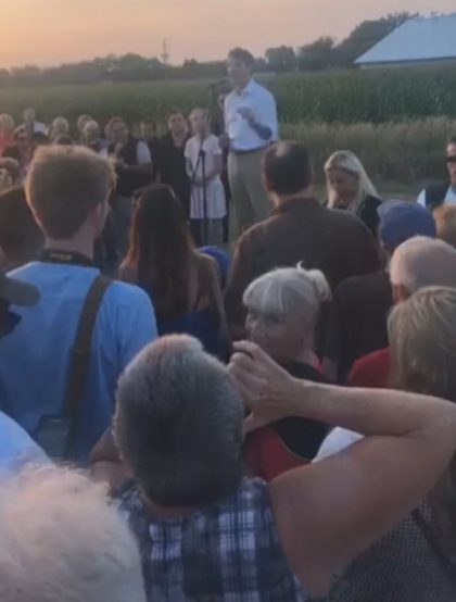 会场上一位妇女向正在讲话的特鲁多喊话发问(Carl Brochu/Facebook/CBC)