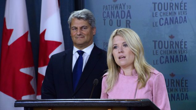 保守党移民事务影子部长Michelle Rempel, 和同僚Gerard Deltell星期三在渥太华共同主持移民政策发布会(THE CANADIAN PRESS/Sean Kilpatrick