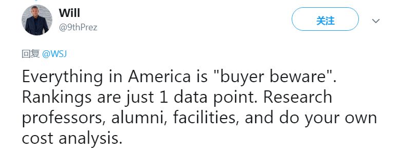 “ 美国的一切都是:买家需当心,排行只是一个数据点,调查研究教授、 校友、 设施,??做你自己的成本分析。”