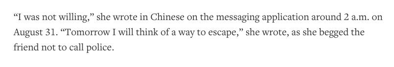 “我不愿意。明天我会想办法逃走。”同时,她恳求她的好友不要报警。她在微信中说:“他能压下来的。你低估了他的能力。”该女生的律师Wil Florin向路透证实,这微信确实是她发的。