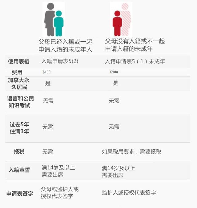 据报道,未成年人士即使父亲或母亲不是加拿大人,又或者没有跟随父母一起申请入籍,只要本身是永久居民,过去5年内在本国住满3年,而且有缴交入息税,便可以自行填表申请入籍;假如该未成年人士有父母陪同申请入籍,则毋须达到过去5年在本国常住满3年、及缴交入息税的要求。
