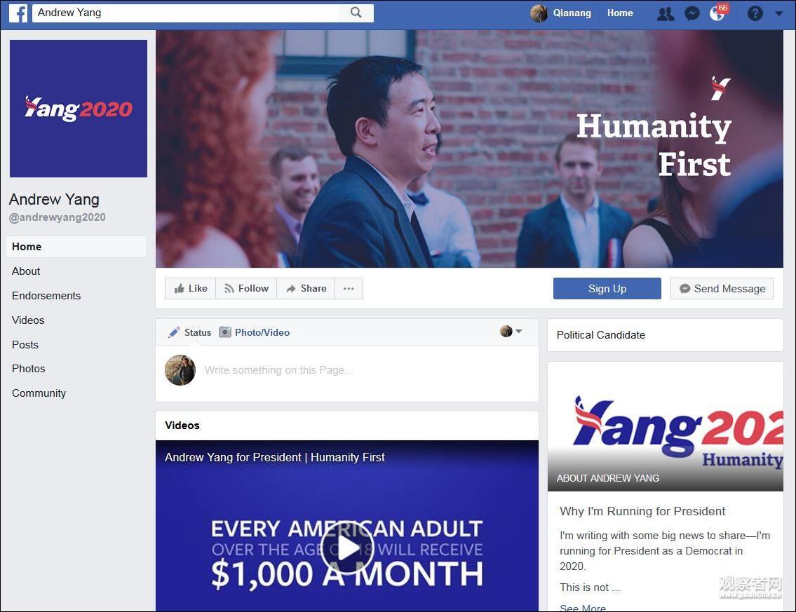 杨安泽的Facebook页面也在给自己的参选“打广告”,其“人性至上”的标语随处可见 |