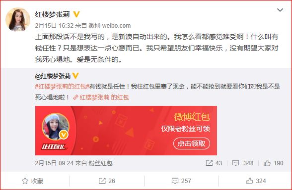 张莉随后马上发微博称:上面那段话不是我写的,是新浪自动出来的。我怎么看都感觉难受啊!什么叫有钱任性?只是想表达一点心意而已。我只希望朋友们幸福快乐,没有期望大家对我死心塌地。爱是无条件的。