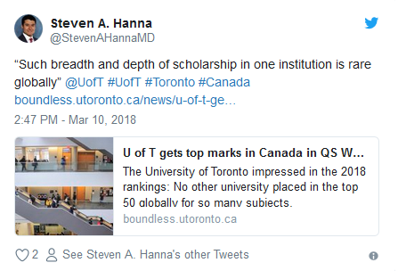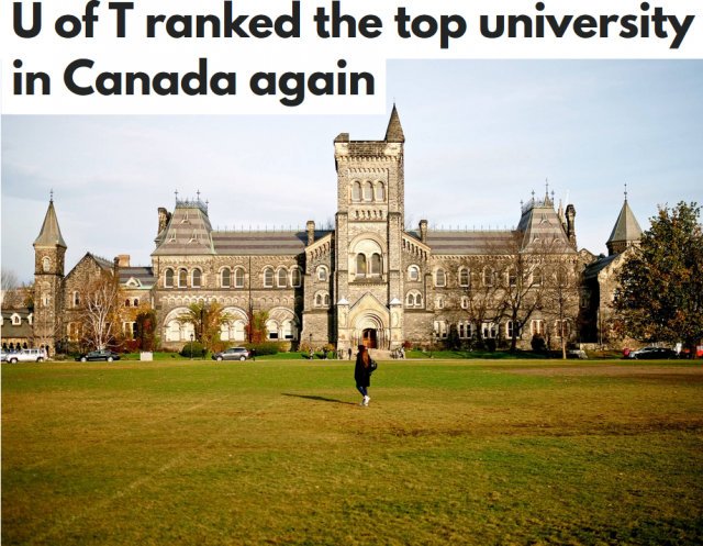 根据2018年QS世界大学排名(QS World University Rankings),多伦多大学学术声望得分99.7,在全球排名第31,夺得加拿大最佳大学桂冠,而麦吉尔大学则刚好排在多大之后,名列第32位。